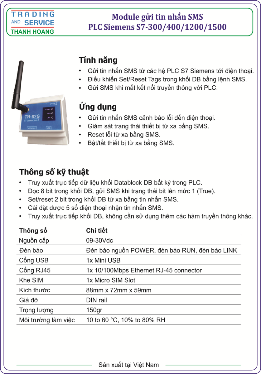 Thanh Hoàng là đơn vị chuyên cung cấp giải pháp và thiết bị trong ngành tự động hóa tại Việt nam. Với mong muốn ngày càng đưa ra thị trường nhiều giải pháp và thiết bị đáp ứng nhu cầu thực tiễn tại các nhà máy. Chúng tôi xin giới thiệu tới Quý khách hàng sản phẩm: "Module gửi tin nhắn SMS cho PLC Siemens S7". Thiết bị được sản xuất tại Việt nam.