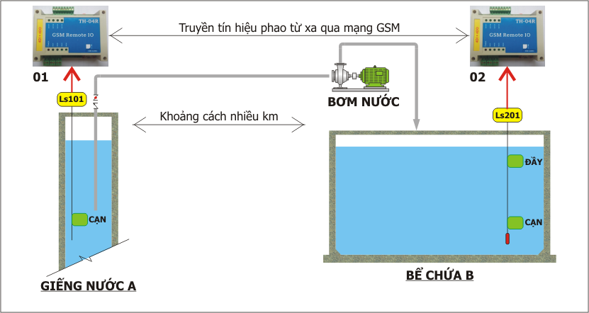 - Tín hiệu phao từ giếng A truyền đến Bể chứa B và ngược lại từ B đến A thông qua mạng không dây GSM.